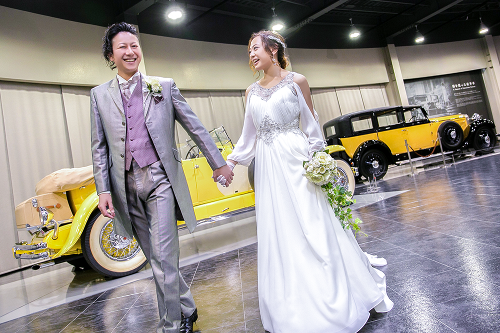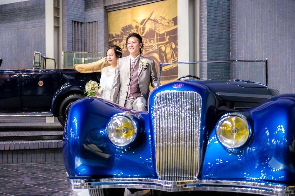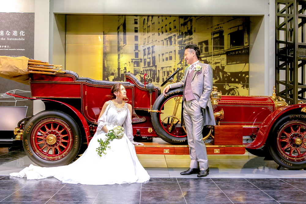 当日は博物館内に展示されている数々の名車の中から新郎新婦が選んだクルマと共にウェディングフォトを撮影。華やかなドレスをまとった新婦とクラシックな名車達は素敵にマッチしていました。