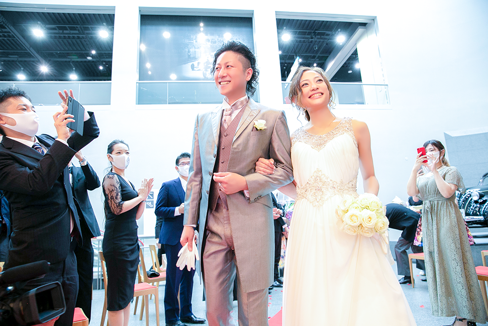 そして、いよいよ始まるお二人の挙式。ハレの舞台は博物館エントランスホール。大階段から新郎の入場。同館のシンボルであるクラシックカー「トヨダAA型」の前までつながるレッドカーペットの上をお父様にエスコートされ新婦が入場して人前式の始まりです。ゲストの皆さまとトヨタのシンボルカーの前で愛を誓いあうおふたり。祝福のフラワーシャワーを浴びる新郎新婦。そこにいるすべての人が幸せに包まれた瞬間でした。