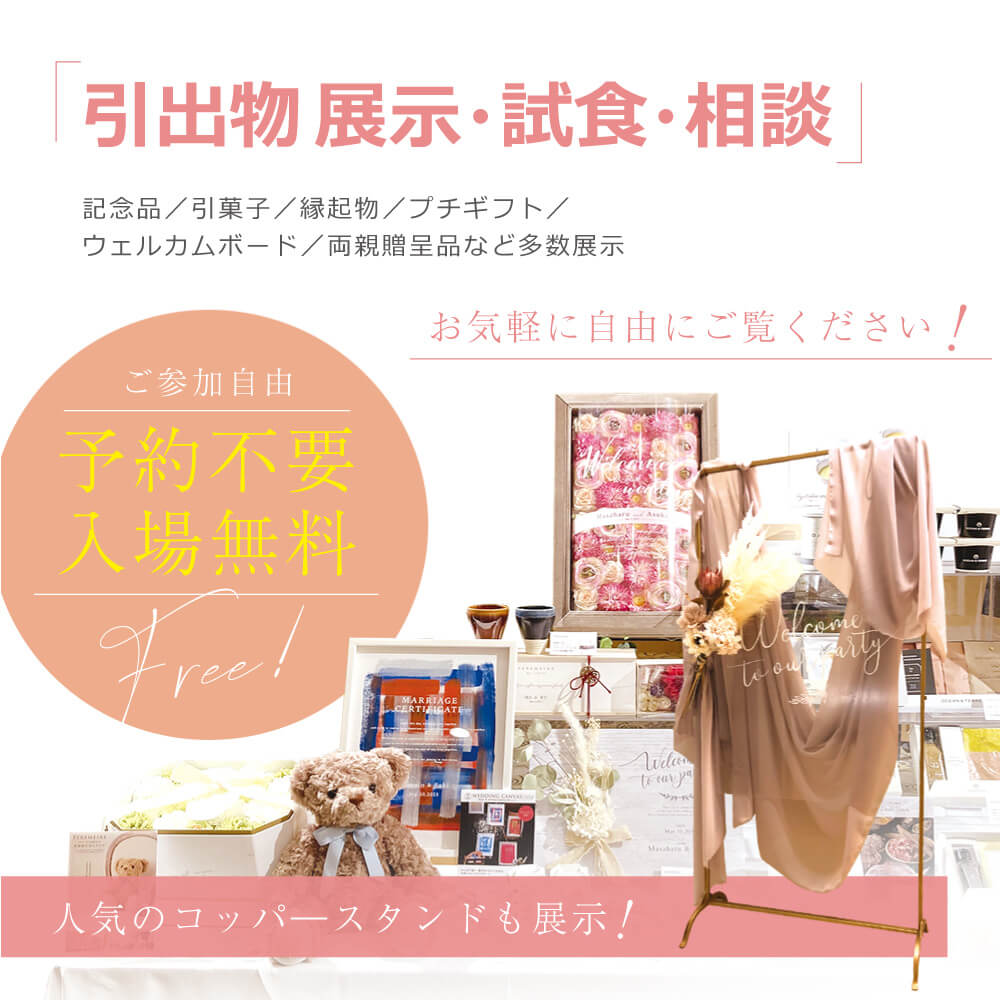 記念品・引菓子・縁起物といった引出物ギフトはもちろん、両親贈呈品やプチギフト、ウェルカムボードなどの結婚式の必須アイテムもいっぱいに展示され、さらには、引菓子のご試食も♪