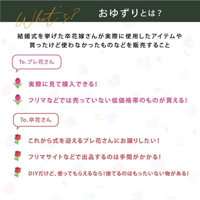 おゆずりとは、卒花さまが実際に使用したアイテムや購入したけど使用しなかったアイテムを、これから結婚式を挙げられるプレ花さまにお値打ちに販売することです。
