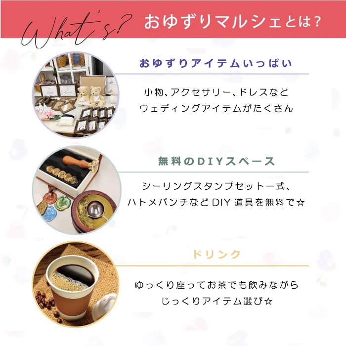 プレ花さまは、ティアラの『おゆずりマルシェ』に来ていただければ、アイテムを実際に見ることができ、フリマなどでは売っていない低価格帯のものもご購入いただけます。