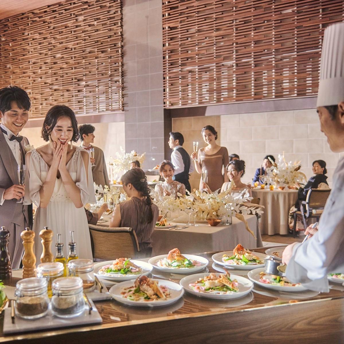 オープンキッチンで披露宴開始と同時に調理を始め、ゲストのすぐ近くで調理することで「安心感」をお届けします。 料理をご提供するプレートは約100度で保温。 ゲストのお食事の進み具合を確認し「ベストなタイミング」で出来立てのお料理をテーブルへと運びます。 土日朝のフェアなら、オープンキッチンからの出来立てのお料理を当日さながらに体験できます。
