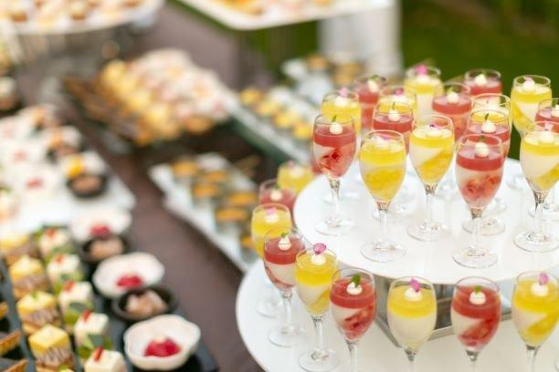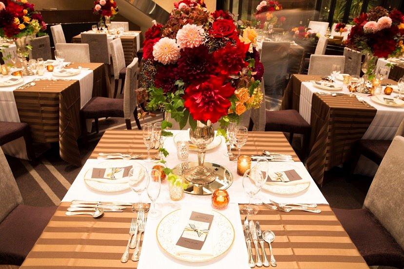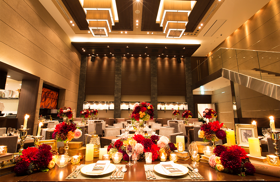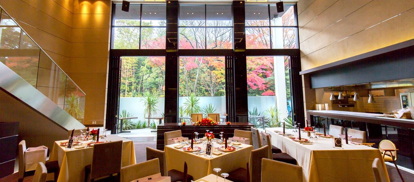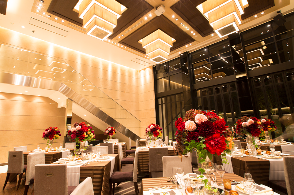 高い天井と窓の外に広がる緑で開放感に満ちた優雅なパーティ会場。