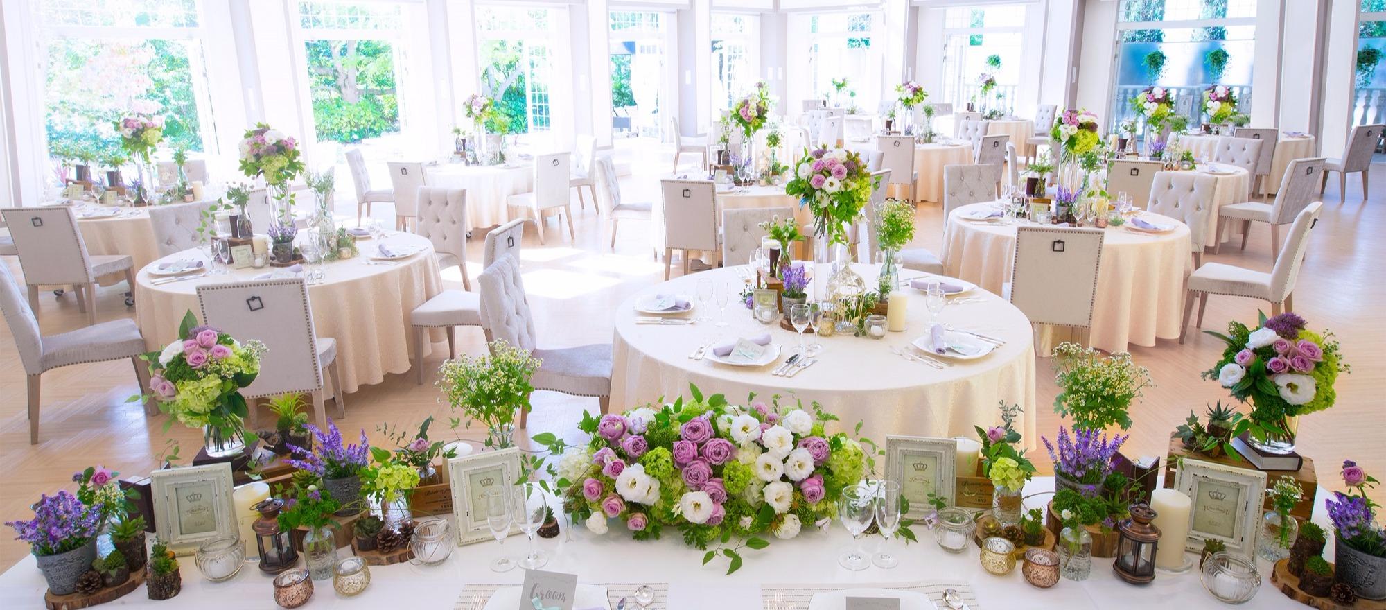 開放感に満ちた優雅なパーティ会場。 窓の外には緑あふれるガーデンを臨むことができます。 おふたり色にコーディネートされた純白の大空間で、こだわりのたくさん詰まった素敵なパーティを! 大階段からの入場演出やガーデンを使ってのデザートビュッフェ、 最新機器による映像演出やプロジェクションマッピングなど演出のアレンジも多彩。