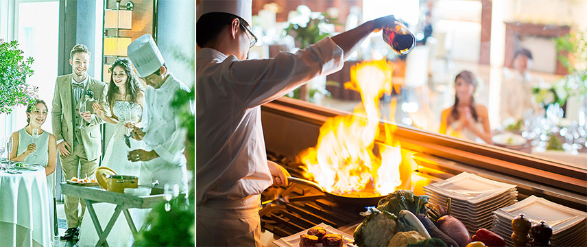 会場内の全施設を自由に使えるので、 バルコニーからの入場演出や前室でのデザートビュッフェなど、 自由度の高いオリジナルウエディングにもぴったりです。 窓から差し込む自然光が入場シーンをより感動的に演出。