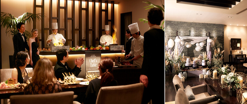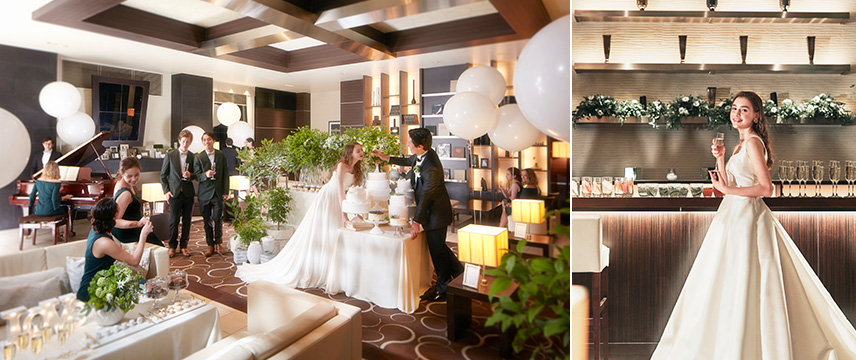 ダークブラウンを基調とした落ち着きのあるモダンスイート。 洗練されたインテリアが上質な雰囲気を生み出します。 パーティ会場と同等の広さを持つ専用ロビーでは、 生演奏やデザートビュッフェなど、多彩な演出が叶います。 最大着席人数:120名